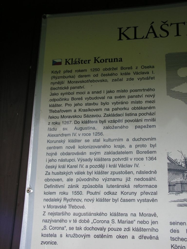 Listinou z 26. dubna 1267, kterou Boreš z Rýzmburka daroval bratřím poustevníkům část ze svých moravskotřebovských držav, položil základ nejstaršího moravského kláštera augustiniánů eremitů. Ten byl vysazen krátce nato pod jménem Koruna sv. Marie.